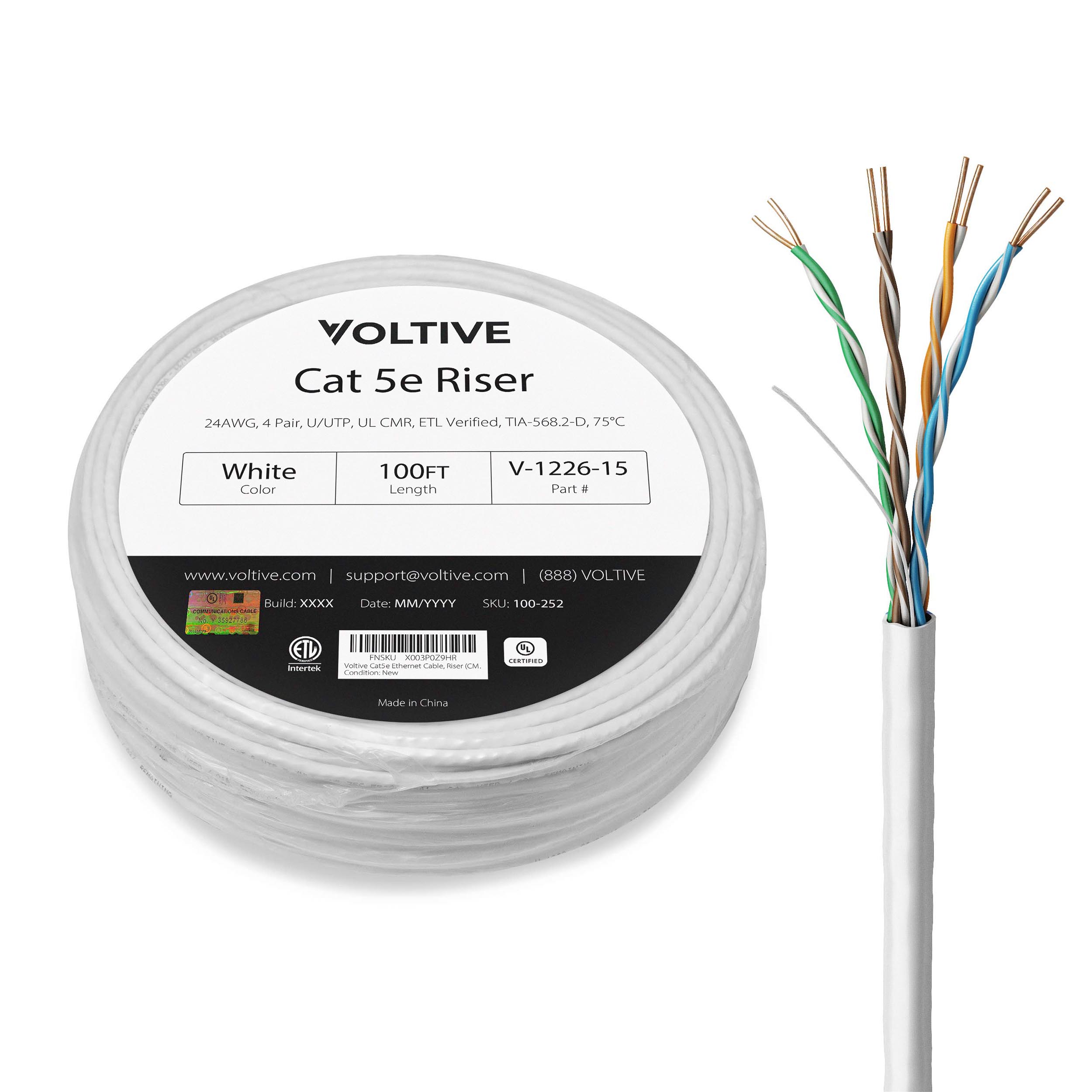 Category 5e UTP. 24 gauge, 4 pair, unshielded, solid bare copper conductors. Supports 2.5 Gbit/s up to 328ft, tested to 350MHz. ETL Verified. Supports 4PPoE/PoE++. Riser (CMR) fire safety rated. UL Certified.